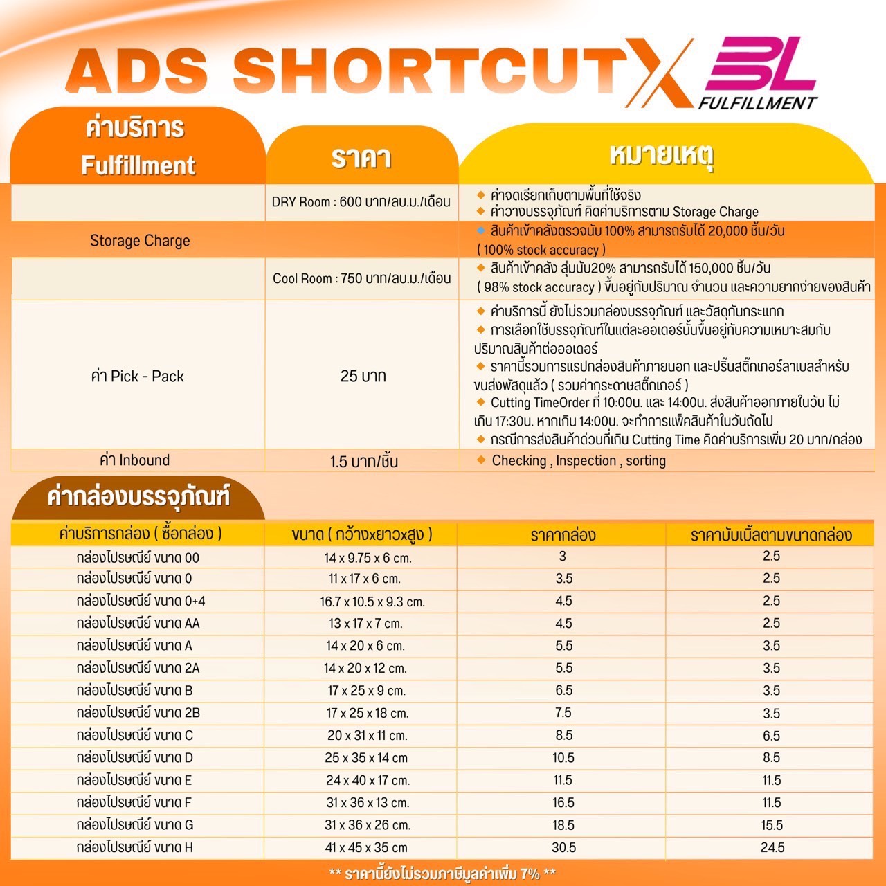 สำหรับลูกค้าที่ต้องการมืออาชีพและเป็นอันดับ 1 ดูแลทาง Ads Shortcut ได้ทำการเชื่อมระบบกับ BL Fulfilments โกดังสินค้าอันดับ 1 ของประเทศไทยด้วยงบลงทุนกว่า 2000 ล้านบาท สามารถส่งสินค้าได้มากกว่า 100,000 ออเดอร์ต่อวัน มีระบบจัดการสินค้าที่ดีที่สุด ห้องความคุมอุณหภูมิสำหรับสินค้าที่ต้องการความเย็นและ สายพานความยาว 4 กิโลเมตร คัดแยกสินค้าตามหมวดหมู่อย่างมืออาชีพ เพื่อให้แบรนด์ทำงานได้อย่างรวดเร็วแม่นยำและเอาชนะคู่แข่งได้